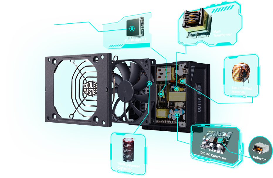 The V SFX Platinum features a DC-DC converter choke crafted with flat copper wiring, a flat transformer pile, and a full-bridge LLC with aluminum plate dissipation. Through these key features and an advanced manufacturing process, the V SFX Platinum achieves maximum strength in a small, space-saving package.